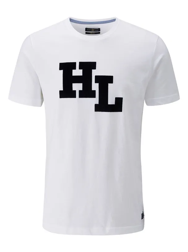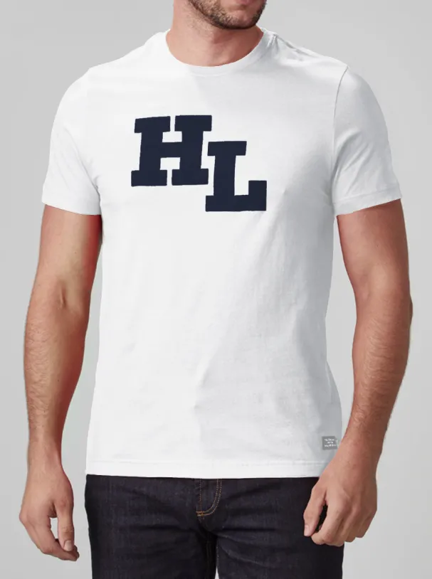 Regular fit. Pure cotton. Ribbed crew neckline. ‘HL’ initials printed in varsity style at chest in felt.
